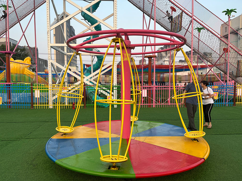 我公司生產的旋轉太空人是一款小成本趣味性強的無動力游樂設施,直徑3米,裝備4個太空艙,游客進去就能體驗失重離心的感覺,還有彈簧板,攀巖繩等設施,推動底盤就能自動旋轉,大人小孩都能玩。