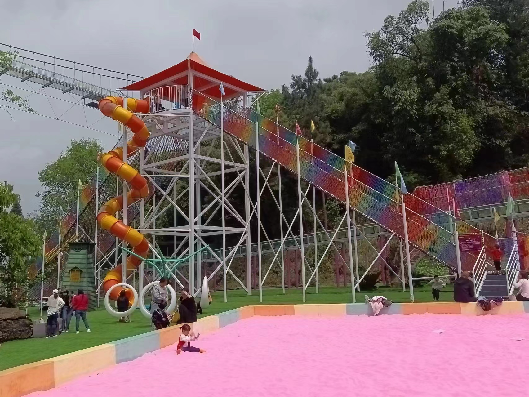 勇攀高峰是樂(lè)園的標(biāo)志性設(shè)備,由攀爬網(wǎng)和和滑滑梯組成,中間安裝玻璃站臺(tái),可以根據(jù)預(yù)算選擇高度和寬度,還可以和玻璃棧道結(jié)合做成樂(lè)園的地標(biāo)性游樂(lè)項(xiàng)目。是大型親子游樂(lè)園的必備項(xiàng)目。