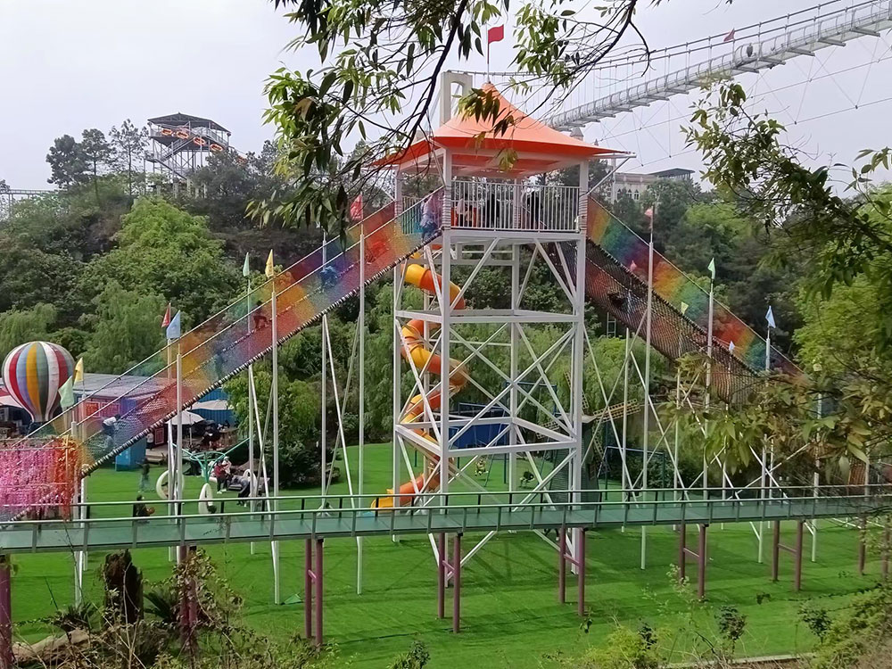 勇攀高峰是樂園的標(biāo)志性設(shè)備,由攀爬網(wǎng)和和滑滑梯組成,中間安裝玻璃站臺,可以根據(jù)預(yù)算選擇高度和寬度,還可以和玻璃棧道結(jié)合做成樂園的地標(biāo)性游樂項(xiàng)目。是大型親子游樂園的必備項(xiàng)目。