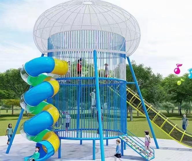 水母蹦床是以水母造型為基礎設計,分為上下兩層蹦床,集蹦床、攀爬、滑梯等多種游樂項目為一體。不但趣味性強,還鍛煉孩子的體質和單量。
